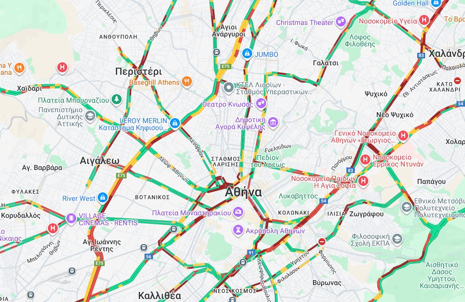 Έντονη κυκλοφοριακή συμφόρηση παρατηρείται αυτή την ώρα στους δρόμους του Λεκανοπεδίου, με τις λεωφόρους Κηφισού, Κηφισίας, Μεσογείων αλλά και την Αττική Οδό, να βρίσκονται στο «κόκκινο» από το μποτιλιάρισμα που επικρατεί.