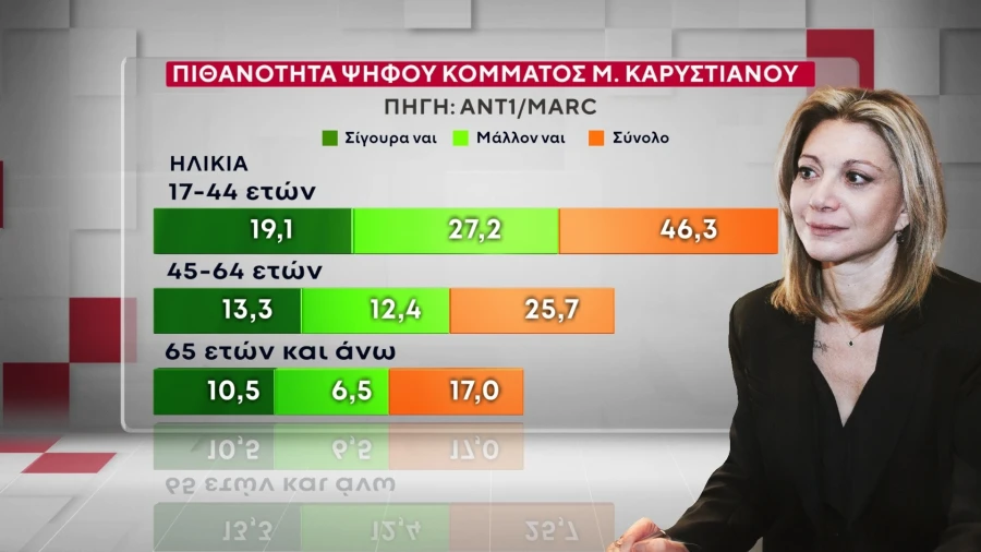 Στην ερώτηση για την πιθανότητα ψήφου σε κόμμα της Μαρίας Καρυστιανού, το 32,3% των ερωτηθέντων απάντησε θετικά (15,1% σίγουρα ναι και 17,2% μάλλον ναι), ενώ το 57,3% απάντησε αρνητικά (15,1% μάλλον όχι και 42,2% σίγουρα όχι).