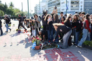 Οι μαθητές μάλιστα έσπασαν την κυβερνητική απαγόρευση για το Μνημείο του Αγνωστου Στρατιώτη και κατέθεσαμ λουλούδια στο σημείο που είναι γραμμάνα τα ονόματα του τραγικού δυστυχήματος στα Τέμπη.