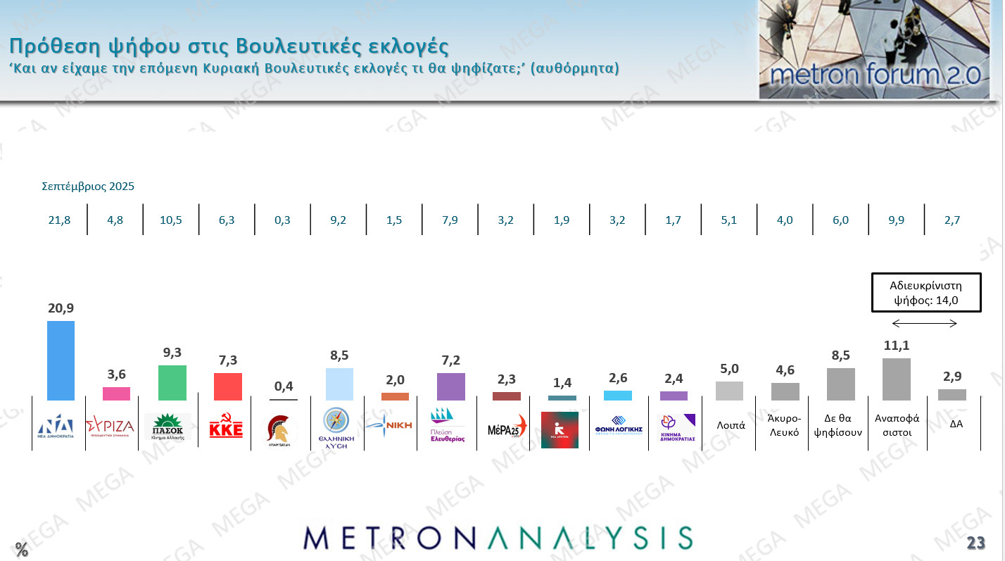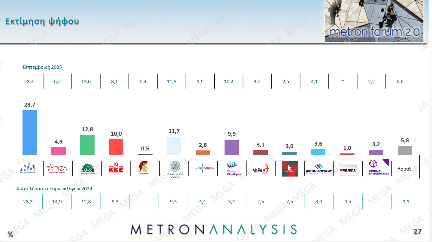 Στην εκτίμηση ψήφου η Νέα Δημοκρατία διακρατεί ένα 28,7% ενώ το ΚΚΕ ενισχύεται με 10%, 11,7% η Ελληνική Λύση, και 9,9% η Πλεύση Ελευθερίας.