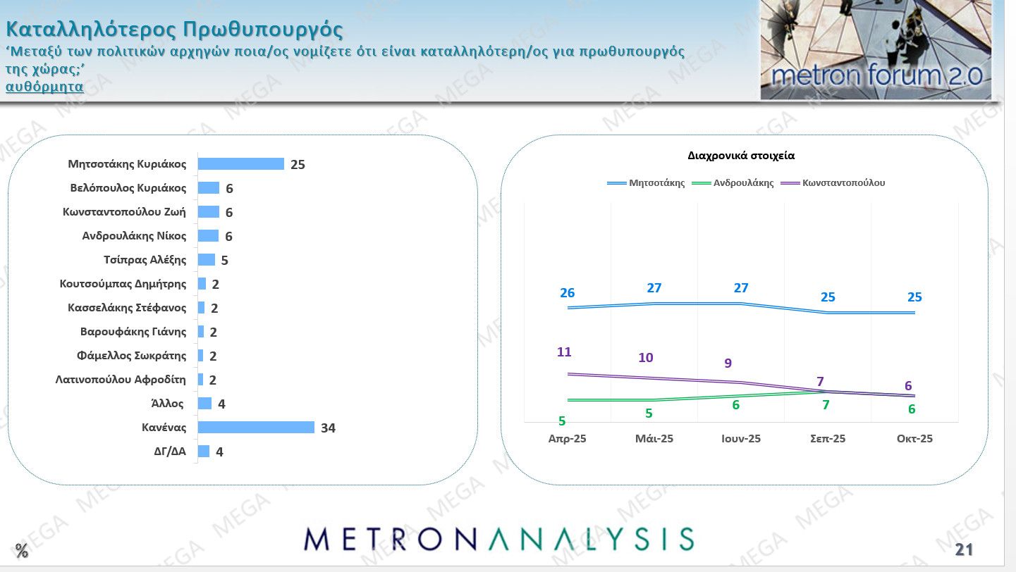 Ωστόσο ο Κυριάκος Μητσοτάκης προβάλλει ως καταλληλότερος για πρωθυπουργός με 25% και αμέσως μετά ο πρόεδρος της Ελληνικής Λύσης με 6%!