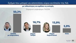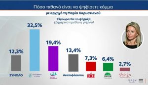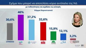 Ιδιαίτερα ενισχυμένη εμφανίζεται η Μαρία Καρυστιανού στους αναποφάσιστους, καθώς πάνω από το 30% εκτιμά ότι θα μπορούσε να εξελιχθεί στον βασικό αντίπαλο της Νέας Δημοκρατίας και να διεκδικήσει με αξιώσεις τη νίκη σε μια εκλογική αναμέτρηση.