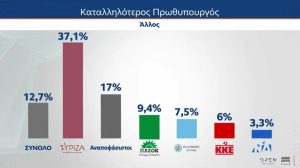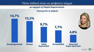 Υπενθυμίζεται ότι στο πρώτο μέρος της δημοσκόπησης, που πραγματοποιήθηκε για λογαριασμό του Open, το 30,6% των ερωτηθέντων απάντησε ότι ένα νέο κόμμα με επικεφαλής τη Μαρία Καρυστιανού θα μπορούσε να συσπειρώσει τον χώρο αριστερά της ΝΔ και να αποτελέσει αξιόπιστη εναλλακτική εξουσίας. Ακολουθούν η απάντηση «κανένα κόμμα» με 20,4%, ένα ενδεχόμενο κόμμα υπό τον Αλέξη Τσίπρα με 19,1% και το ΠΑΣΟΚ με τον Νίκο Ανδρουλάκη με 17,8%.
