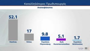 Στο ίδιο ερώτημα στους αναποφάσιστους η Μαρία Καρυστιανού έρχεται πρώτη με 33,3%, ο Αλέξης Τσίπρας ακολουθεί με 14,4% και ο Νίκος Ανδρουλάκης έρχεται τελευταίος με 9,3%.