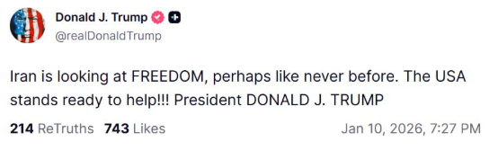 Στη λακωνική του – παραδόξως για τα δεδομένα του  – ανάρτηση ο Αμερικανός δηλώνει πως  «το Ιράν αναζητά την ΕΛΕΥΘΕΡΙΑ, ίσως όπως ποτέ άλλοτε. Οι ΗΠΑ είναι έτοιμες να βοηθήσουν!!! Πρόεδρος ΝΤΟΝΑΛΝΤ ΤΡΑΜΠ».
