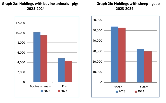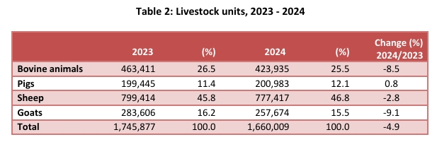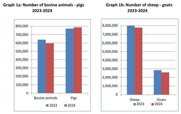 Τα νούμερα δεν συγχωρούν: το 2024, πριν ακόμη φανεί όλο το υγειονομικό σοκ, τα βοοειδή μειώθηκαν -6,8%, τα πρόβατα -2,8% και οι αίγες -9,1%, ενώ οι εκμεταλλεύσεις σε κατηγορίες ζώων επίσης υποχώρησαν. Το λέει η ΕΛΣΤΑΤ, όχι οι «κακές γλώσσες» (ΕΛΣΤΑΤ, 2025)