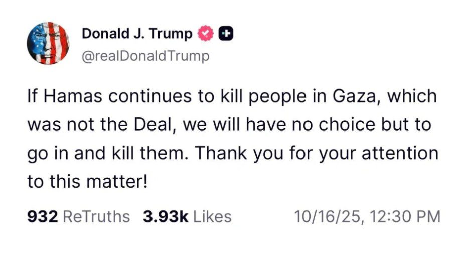Με εξόντωση απειλεί την Παλαιστινιακή Οργάνωση ο Αμερικανός Πρόεδρος ο οποίος δήλωσε πως «αν η Χαμάς συνεχίσει να σκοτώνει ανθρώπους στη Γάζα, κάτι που δεν ήταν η συμφωνία, δεν θα έχουμε άλλη επιλογή παρά να εισβάλλουμε και να τους σκοτώσουμε».