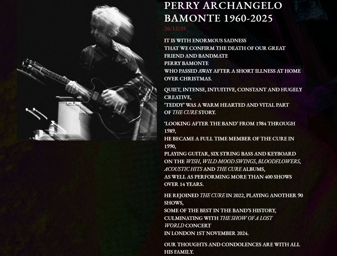 «Με μεγάλη θλίψη επιβεβαιώνουμε τον θάνατο του μεγάλου μας φίλου και μέλους της μπάντας Πέρι Μπαμόντε. Ήσυχος, έντονος, διαισθητικός, σταθερός και εξαιρετικά δημιουργικός, ο «Τέντι» ήταν ένα ζεστό και ζωτικό μέρος της ιστορίας των The Cure. Οι σκέψεις και τα συλλυπητήριά μας πηγαίνουν σε όλη την οικογένειά του, θα μας λείψει πολύ», αναφέρεται στη δήλωση.