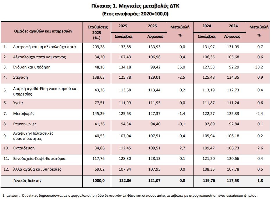 Η αύξηση του Γενικού ΔΤΚ κατά 0,8% τον μήνα Σεπτέμβριο 2025, σε σύγκριση με τον αντίστοιχο Δείκτη του Αυγούστου 2025, προήλθε κυρίως από τις μεταβολές στις ακόλουθες ομάδες αγαθών και υπηρεσιών: