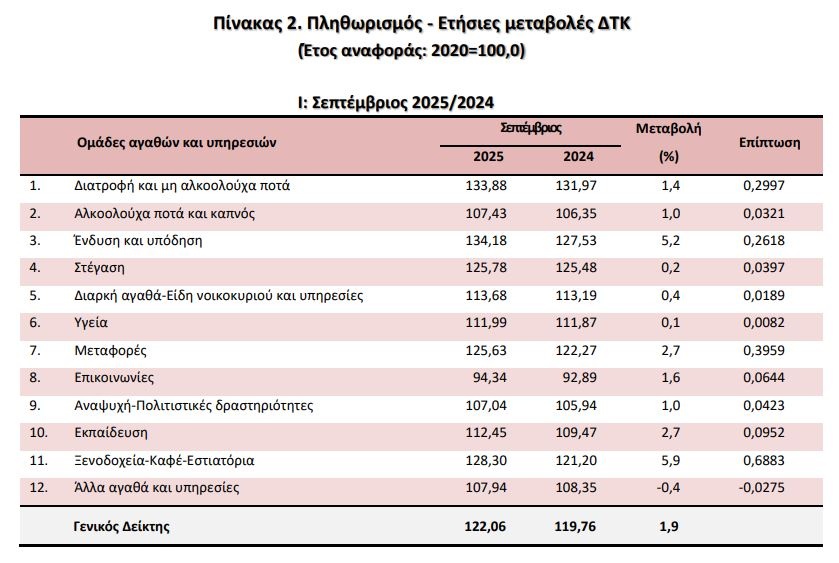 Η αύξηση του Γενικού ΔΤΚ κατά 1,9% τον μήνα Σεπτέμβριο 2025, σε σύγκριση με τον αντίστοιχο Δείκτη του Σεπτεμβρίου 2024, προήλθε κυρίως από τις μεταβολές στις ακόλουθες ομάδες αγαθών και υπηρεσιών: