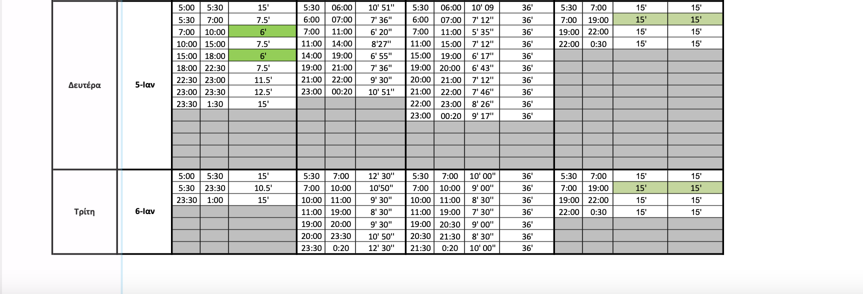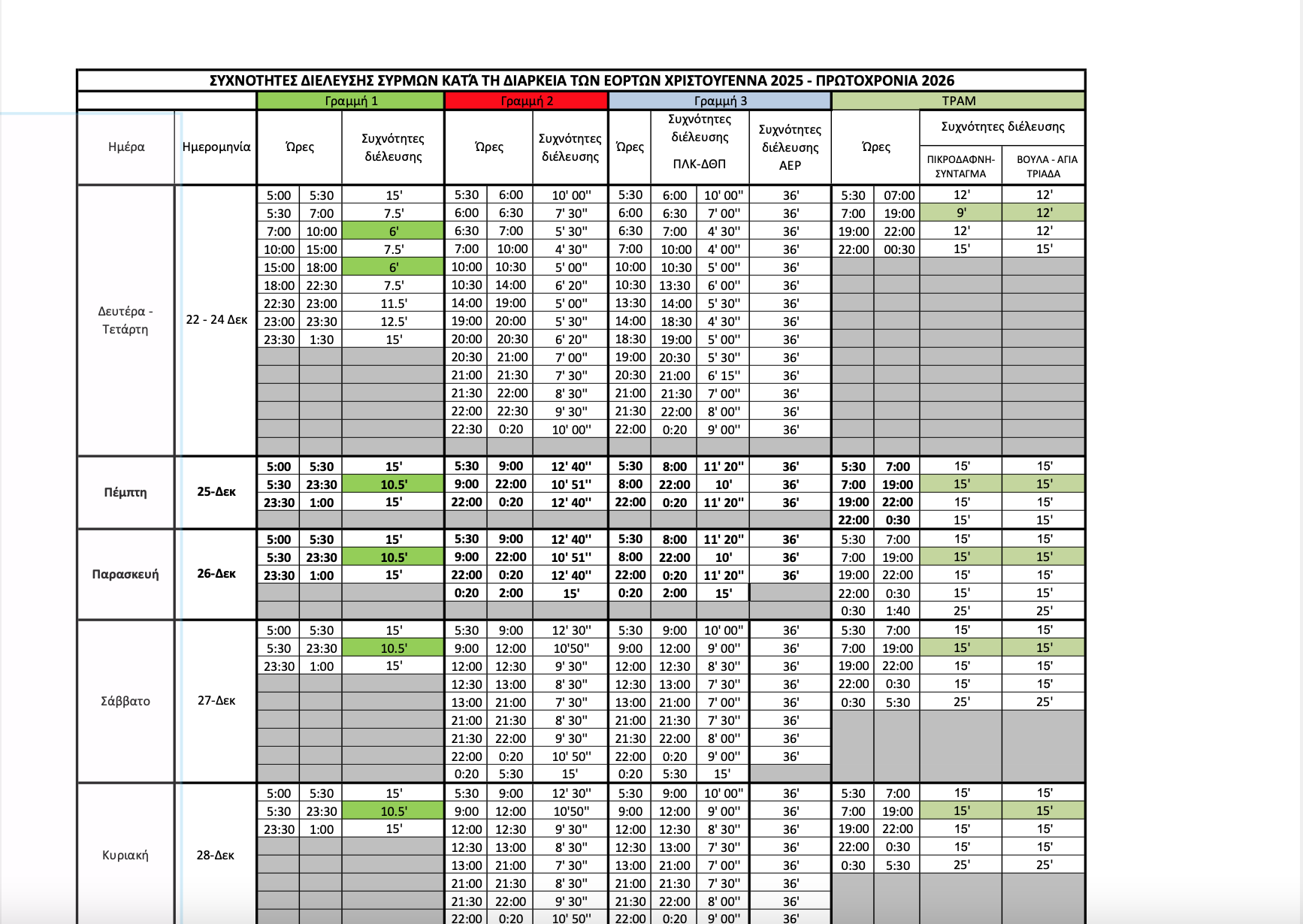 Για τις συχνότητες δρομολογίων των μέσων σταθερής τροχιάς (Γραμμές Μετρό 1, 2, 3 και Τραμ) κατά τις ημέρες των εορτών μπορείτε να ενημερωθείτε αναλυτικά: