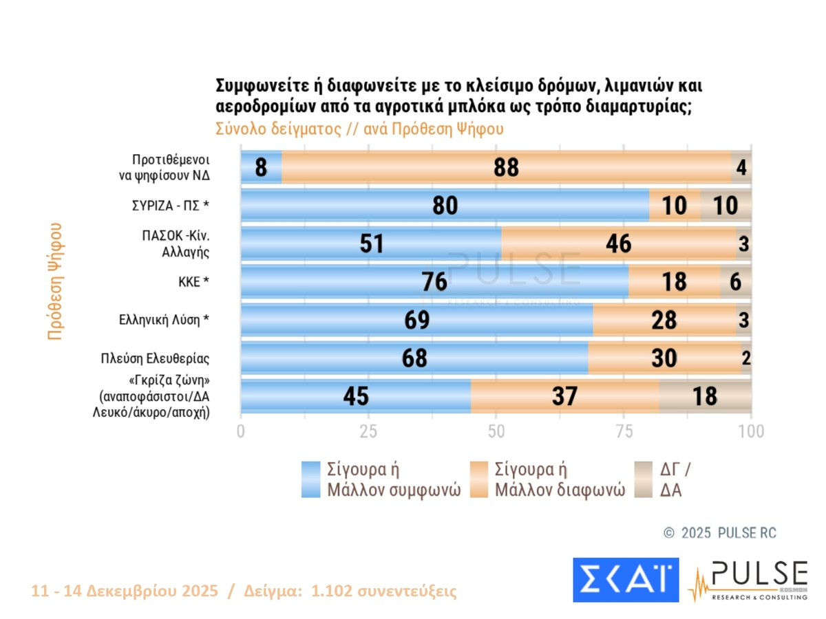Η μεγάλη διαφοροποίηση από τους ψηφοφόρους της ΝΔ έρχεται στον τρόπο αντίδρασης, καθώς η συντριπτική τους πλειοψηφία διαφωνεί με τα μπλόκα στις οδικές αρτηρίες, λιμάνια και αεροφρόμια.