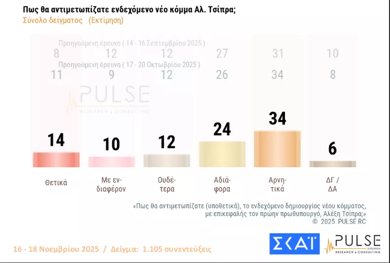 Αυξάνουν την αποδοχή τους τα ενδεχόμενα κόμματα Τσίπρα και Σαμαρά, σύμφωνα με τη δημοσκόπηση της Pulse που διενεργήθηκε για λογαριασμό του ΣΚΑΙ, η οποία αποτυπώνει το ειδικό πολιτικό βάρος του κ. Σαμαρά στον κόσμο της ΝΔ καθώς ένα ποσοστό σχεδόν 30% των απογοητευμένων της ΝΔ φλερτάρει ανοιχτά με το ενδεχόμενο κόμμα του πρώην πρωθυπουργού.