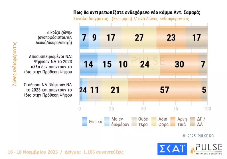 Αυξάνουν την αποδοχή τους τα ενδεχόμενα κόμματα Τσίπρα και Σαμαρά, σύμφωνα με τη δημοσκόπηση της Pulse που διενεργήθηκε για λογαριασμό του ΣΚΑΙ, η οποία αποτυπώνει το ειδικό πολιτικό βάρος του κ. Σαμαρά στον κόσμο της ΝΔ καθώς ένα ποσοστό σχεδόν 30% των απογοητευμένων της ΝΔ φλερτάρει ανοιχτά με το ενδεχόμενο κόμμα του πρώην πρωθυπουργού.