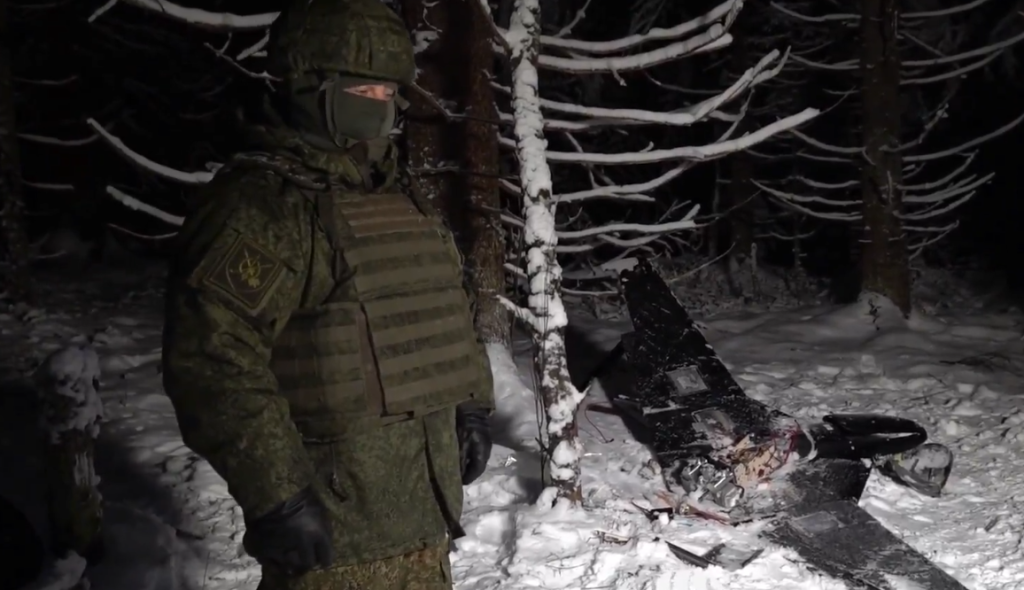 Στο νυχτερινό οπτικό υλικό διακρίνεται ένα κατεστραμμένο drone πεσμένο στο χιόνι, μέσα σε δασική έκταση. Το Υπουργείο Άμυνας της Ρωσίας υποστηρίζει ότι πρόκειται για τμήμα μιας «στοχευμένης και προσεκτικά σχεδιασμένης τρομοκρατικής επίθεσης», η οποία εκδηλώθηκε σε διαδοχικά στάδια.