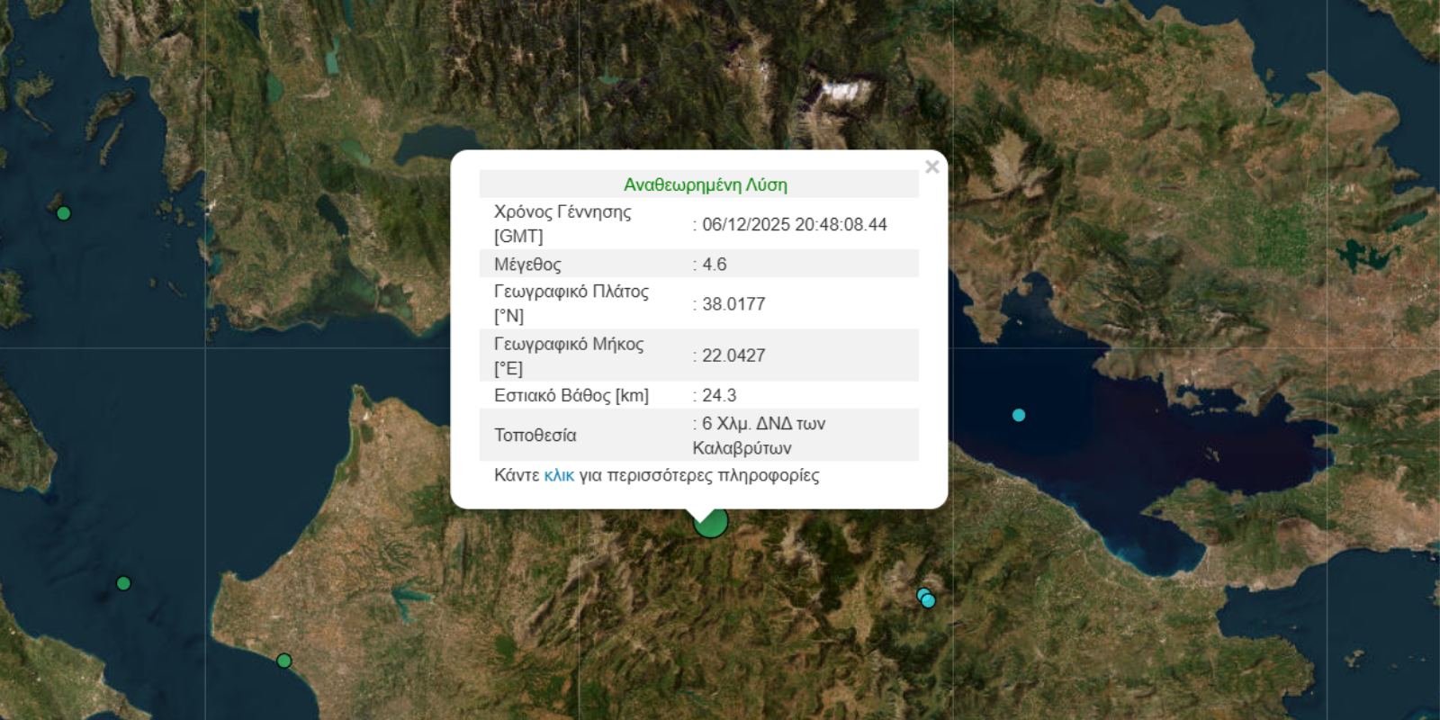 Σεισμική δόνηση μεγέθους 4,6 Ρίχτερ σημειώθηκε το βράδυ του Σαββάτου 6 Δεκεμβρίου στα Καλάβρυτα.