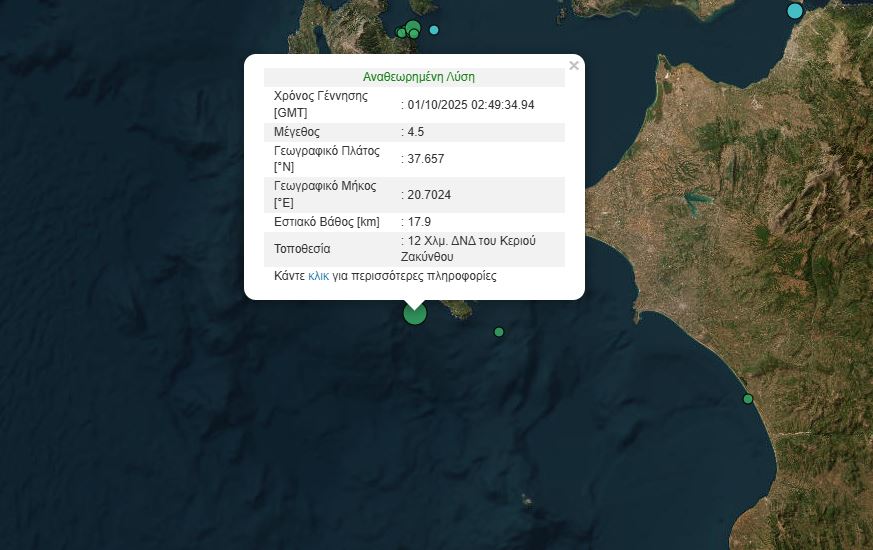 Σεισμός μεγέθους 4,5 βαθμών στην κλίμακα Ρίχτερ σημειώθηκε σήμερα 1η Οκτωβρίου στις 05:49 ανοικτά των νοτιοδυτικών ακτών της Ζακύνθου.