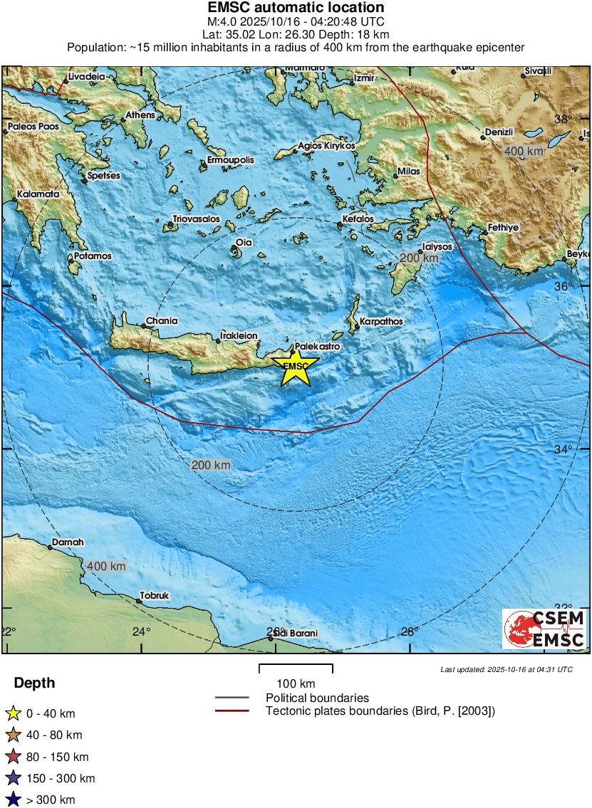 Από την πλευρά του, το Ευρωπαϊκό – Μεσογειακό Σεισμολογικό Ινστιτούτο (EMSC), δίνει το σεισμό στα 4,0 Ρίχτερ, με επίκεντρο τα 30 χλμ. νοτιοανατολικά της Σητείας και εστιακό βάθος τα 18 χλμ.