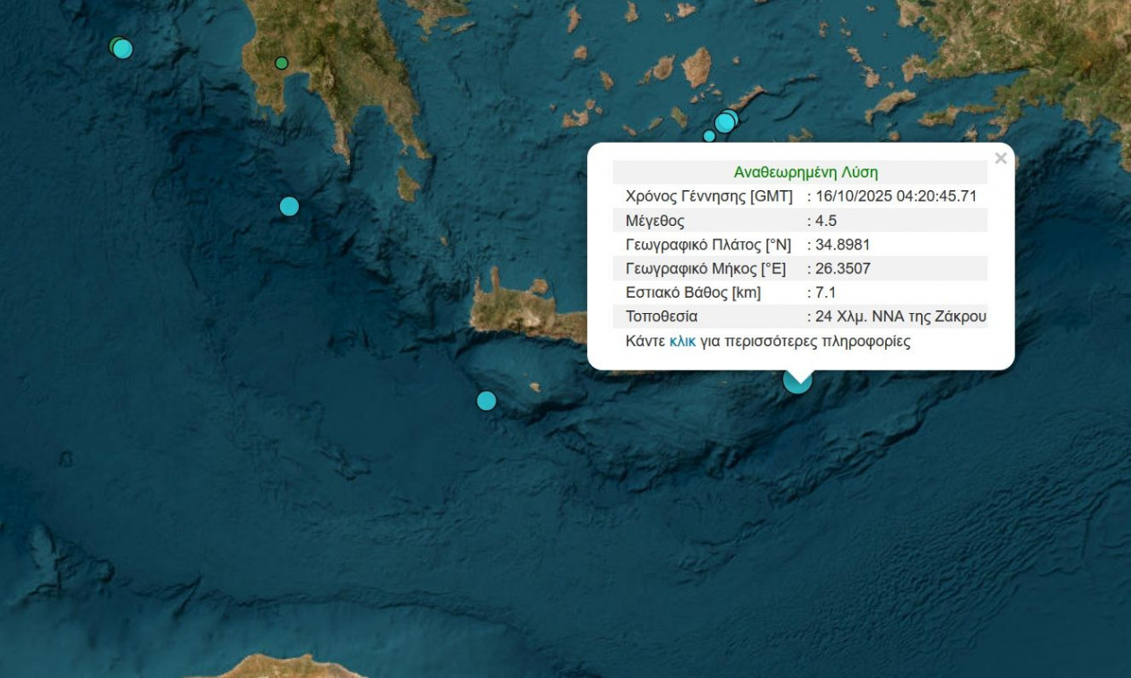 Σεισμική δόνηση μεγέθους 4,5 βαθμών της κλίμακας Ρίχτερ, σύμφωνα με την αναθεωρημένη λύση του Γεωδυναμικού Ινστιτούτου του Αστεροσκοπείου Αθηνών,σημειώθηκε το πρωί της Πέμπτης (16/10), στις 07:20, κοντά στις ακτές της ανατολικής Κρήτης.