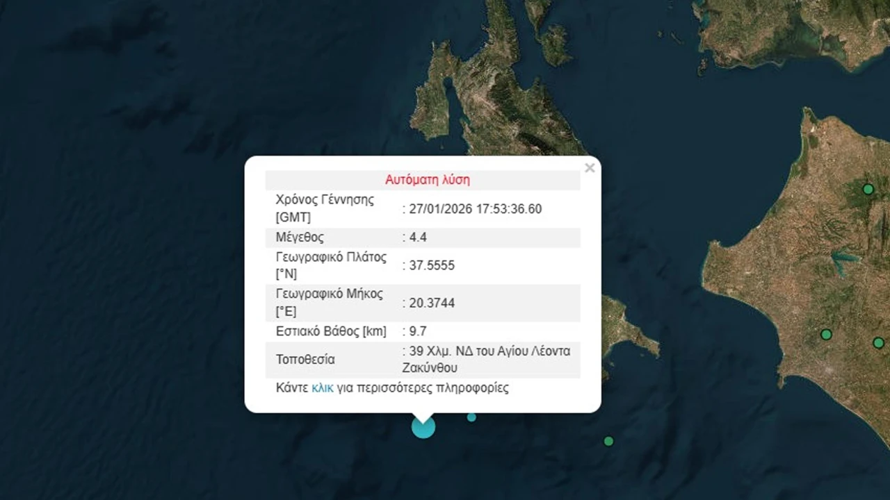 Σεισμός μεγέθους 4,4 βαθμών της κλίμακας Ρίχτερ σημειώθηκε το βράδυ της Τρίτης ανοιχτά της Ζακύνθου.