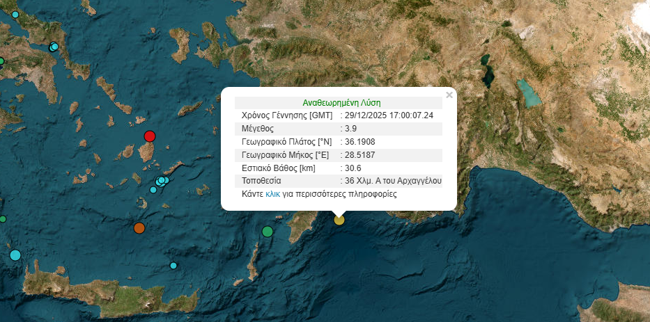 Σεισμική δόνηση μεγέθους 3,9 ρίχτερ σημειώθηκε στις 19:00 το απόγευμα της Δευτέρας 29/12, στα ανοιχτά της Ρόδου.