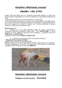Σε μία κίνηση που υπογραμμίζει τη σοβαρότητα του συμβάντος, η Φιλοζωική Ομοσπονδία Ελλάδος (ΦΟΕ) καταδίκασε απερίφραστα το περιστατικό και ανακοίνωσε χρηματική αμοιβή ύψους 1.500 ευρώ για όποιον παράσχει πληροφορίες που θα οδηγήσουν στον εντοπισμό και τη σύλληψη του δράστη της φρικιαστικής πράξης.