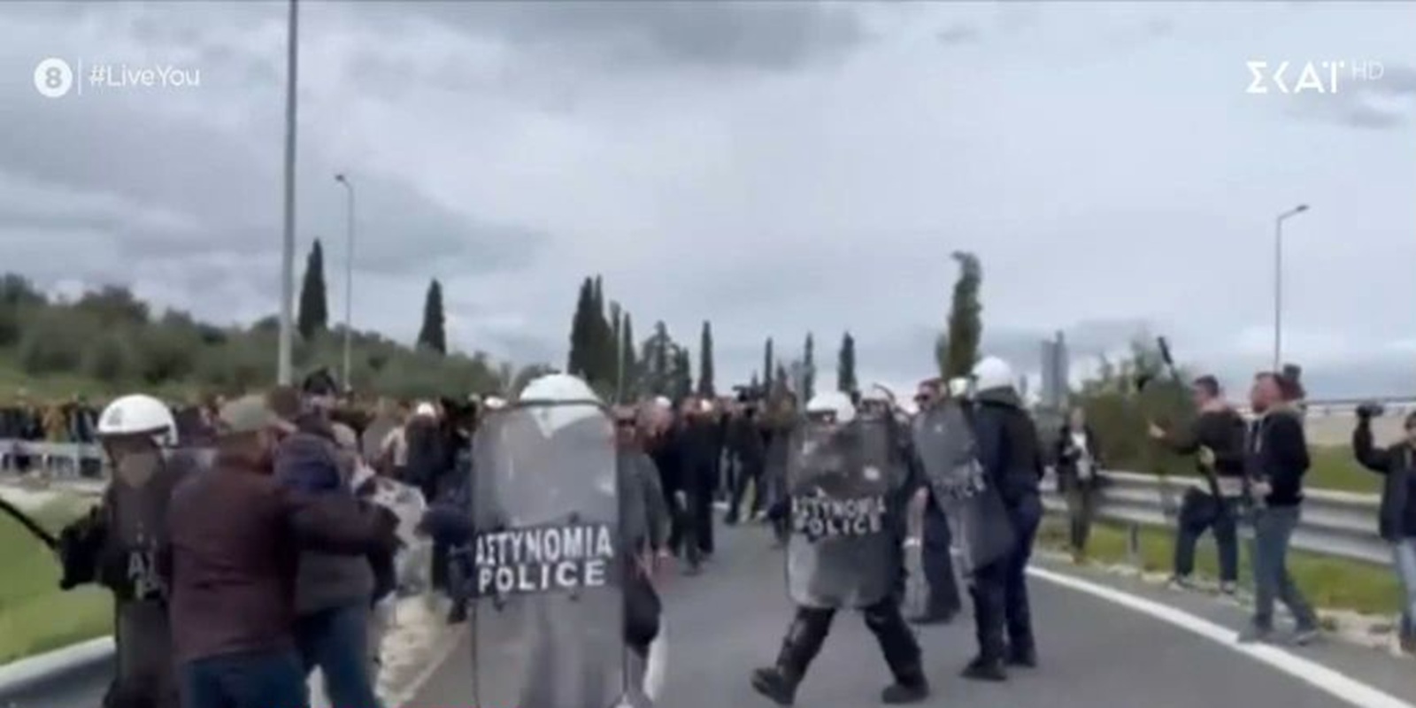 Δυνάμεις των ΜΑΤ τους έκλεισαν τον δρόμο και σημειώθηκαν αψιμαχίες και κάποια σπρωξίματα, πριν τελικά οι αστυνομικοί παραμερίσουν για να περάσουν οι αγρότες.