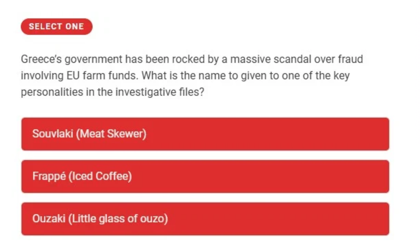 «Η ελληνική κυβέρνηση έχει έρθει αντιμέτωπη με ένα τεράστιο σκάνδαλο απάτης που αφορά αγροτικά κονδύλια. Ποιο είναι το όνομα που έχει δοθεί σε ένα από τα κεντρικά της έρευνας;»