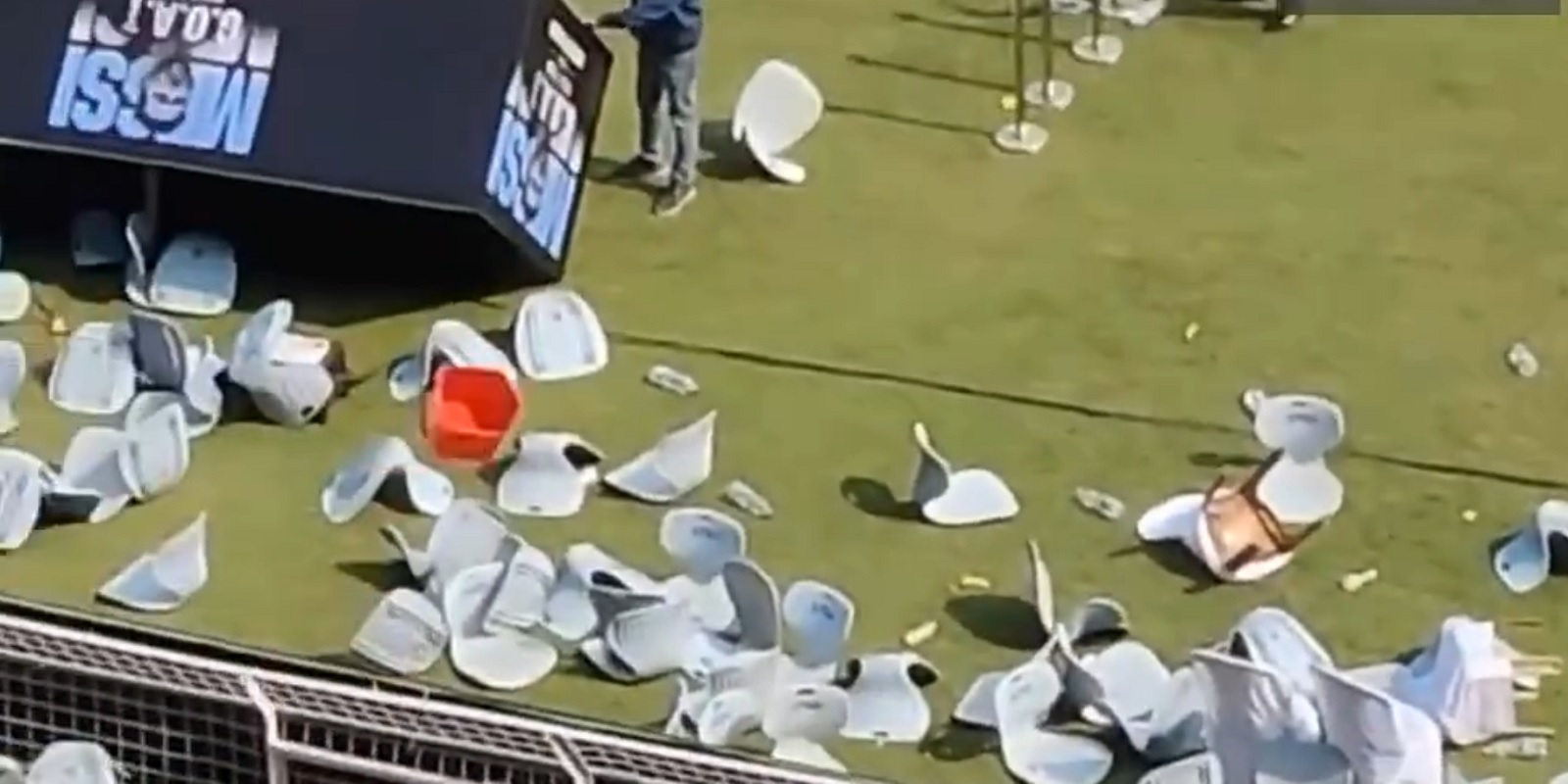Η απογοήτευση μετατράπηκε γρήγορα σε χάος, με εξαγριωμένους οπαδούς να ξηλώνουν καθίσματα από τις εξέδρες και να πετούν μπουκάλια και καρέκλες προς τον αγωνιστικό χώρο. Οι σκηνές που εκτυλίχθηκαν θύμιζαν επεισόδια μεγάλης κλίμακας, ενώ η ατμόσφαιρα έγινε ιδιαίτερα επικίνδυνη τόσο για τους παρευρισκόμενους όσο και για τους διοργανωτές.