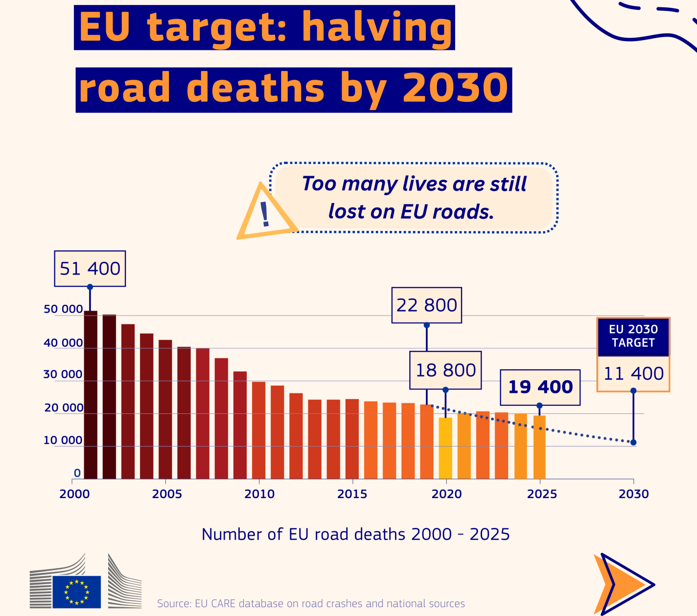 Η Ευρωπαϊκή Επιτροπή δημοσίευσε τα προκαταρκτικά στοιχεία για τους θανάτους από τροχαία το 2025, καταγράφοντας περίπου 19.400 θανάτους. Σε σχέση με το 2024, 580 λιγότεροι άνθρωποι έχασαν τη ζωή τους στους ευρωπαϊκούς δρόμους. (μείωση 3%).