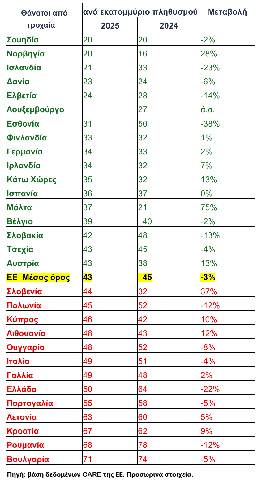 2) Η Ελλάδα εμφάνισε μείωση κατά 22% του αριθμού θανάτων από τροχαίες συγκρούσεις το 2025 (517) σε σχέση με το 2024 (665). Δεν υποτιμούμε αυτό το γεγονός, που συμβαίνει σε τέτοιο μέγεθος πρώτη φορά. Αλλά δεν πανηγυρίζουμε. Όχι μόνο γιατί ο αριθμός νεκρών και τραυματιών εξακολουθεί να παραμένει εξαιρετικά υψηλός αλλά κυρίως γιατί αυτή η μείωση πρέπει να αποδειχτεί μια σταθερή διαχρονική τάση.