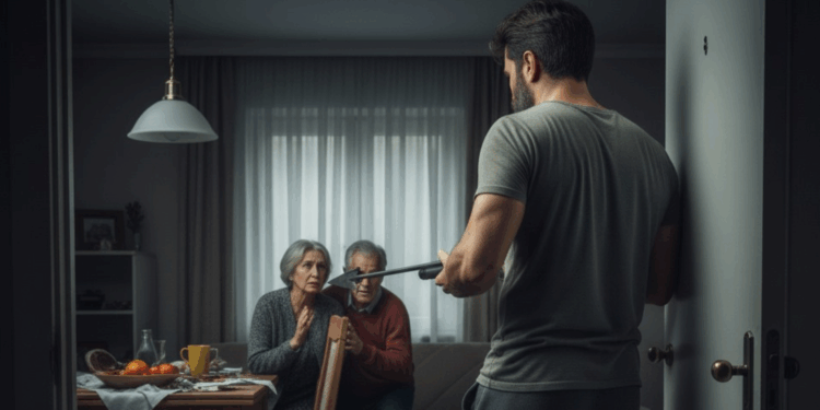 Στη συνέχεια, όπως κατήγγειλε ο πατέρας, ο γιος «πήρε το ψαροντούφεκο, πλησίασε εμένα και τη γυναίκα μου, και μας είπε ότι δεν θα γλιτώσει κανείς. Φοβηθήκαμε, ανοίξαμε την πόρτα και τρέξαμε να φύγουμε». Η μητέρα συμπλήρωσε (σύμφωνα με το ΑΠΕ – ΜΠΕ) ότι «όταν δεν του δίνουμε χρήματα, γίνεται επιθετικός. Φοβηθήκαμε πολύ. Όταν ήρθε η αστυνομία, έλεγε ότι θα μας σκοτώσει όλους και θα αυτοκτονήσει».