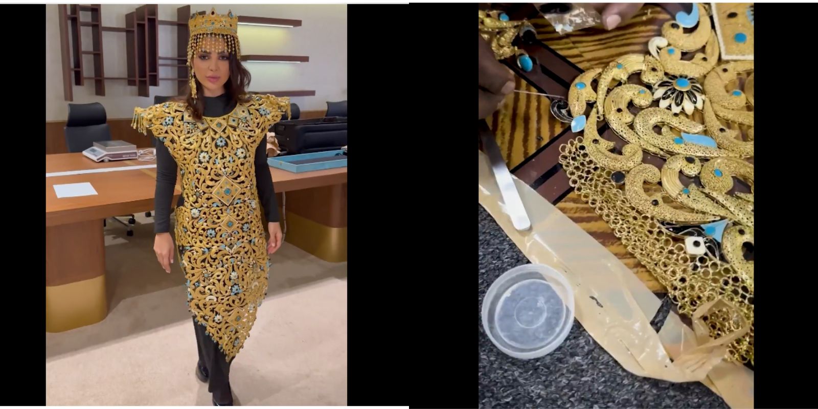 Το εντυπωσιακό ένδυμα, που ζυγίζει 10,08 κιλά και είναι φτιαγμένο εξ ολοκλήρου από χρυσό 21 καρατίων, παρουσιάστηκε δίπλα σε ένα χρυσό στέμμα 398 γραμμαρίων, σκουλαρίκια 34,1 γραμμαρίων και ένα εντυπωσιακό στολίδι 738,5 γραμμαρίων.