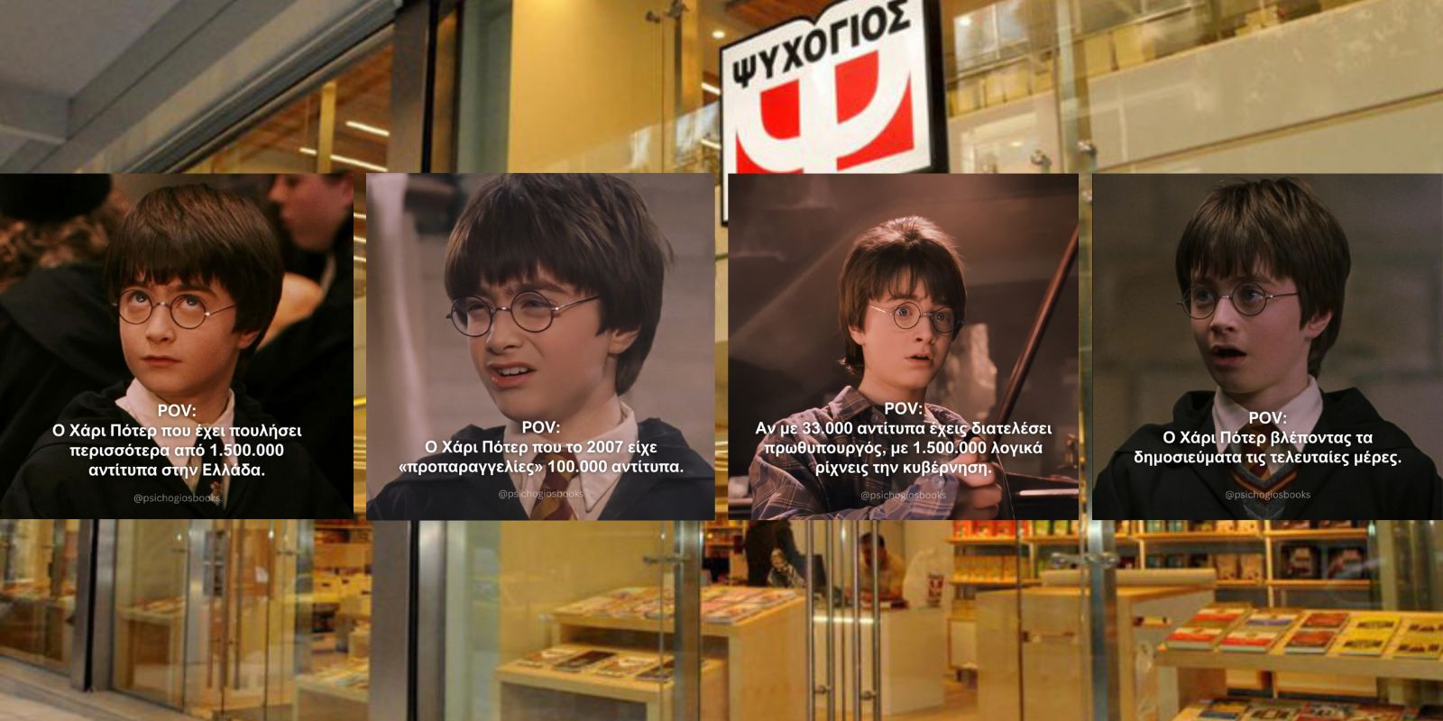 Στη συνέχεια, δημοσίευσαν τέσσερις εικόνες του διάσημου μικρού μάγου, οι οποίες σχολιάζουν, με τον δικό τους τρόπο, την εκδοτική επιτυχία του βιβλίου του πρώην πρωθυπουργού, κάνοντας μια χιουμοριστική σύνδεση πολιτικής και πωλήσεων.