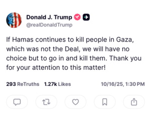 Πριν από την ανακοίνωση του Στέιτ Ντιπάρτμεντ, ο πρόεδρος Τραμπ είχε απευθύνει αυστηρή προειδοποίηση προς τη Χαμάς. Όπως έγραψε σε ανάρτησή του στις 16 Οκτωβρίου, «αν συνεχίσουν να σκοτώνουν κόσμο στη Γάζα, δεν έχουμε άλλη επιλογή από το να μπούμε και να τους σκοτώσουμε».
