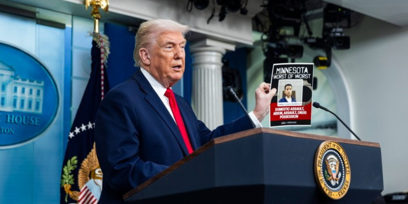 Στη συνέχεια, ο Τραμπ άλλαξε τόνο, αναφερόμενος στην εγκληματικότητα και τη μετανάστευση, παρουσιάζοντας τυπωμένες φωτογραφίες ατόμων που, όπως είπε, συνελήφθησαν στη Μινεσότα. Οι εικόνες έφεραν τον τίτλο «Μινεσότα: Οι Χείριστοι των Χειρίστων».