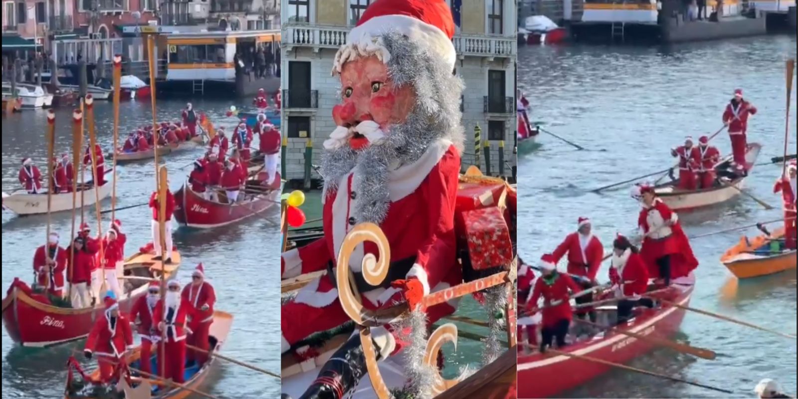 Φέτος τα Χριστούγεννα, η Βενετία φόρεσε τα γιορτινά της με έναν ασυνήθιστο τρόπο: εκατοντάδες Άη Βασίληδες εγκατέλειψαν τα παραδοσιακά έλκηθρά τους και ανέβηκαν σε γόνδολες, δημιουργώντας ένα παραμυθένιο σκηνικό στα διάσημα κανάλια της πόλης.