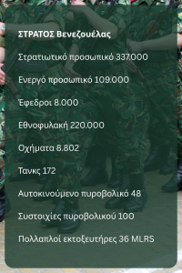 Στον Στρατό τα πράγματα είναι κάπως καλύτερα με τον αριθμό του ενεργού προσωπικού να καταγράφεται στις 337.000 συμπεριλαμβάνοντας την εθνοφυλακή. Σύμφωνα με συναδέλφους στο Καράκας, η κλήση από την κυβέρνηση στον πληθυσμό για να ενισχύσει τις ένοπλες δυνάμεις βρήκε τεράστια ανταπόκριση με τον αριθμό όσων που ανταποκρίθηκαν στο κάλεσμα για ένταξή τους στην πολιτοφυλακή να ξεπερνά τα 4 εκατομμύρια. Δεν υπάρχουν επαρκή στοιχεία για τα τεχνολογικά δεδομένα και χαρακτηριστικά των στρατιωτικών επικοινωνιών πέρα από τη δορυφορική κάλυψη της επικράτειας σε δορυφορικό επίπεδο από την Κίνα. Η Βενεζουέλα χρησιμοποιεί μια υβριδική εφαρμογή με ενσωματωμένη υπηρεσία ανταλλαγής μηνυμάτων η οποία υποστηρίζεται από μια γραμμή βοήθειας, για να ενημερώνουν την κυβέρνηση για οτιδήποτε θα μπορούσε να σχετίζεται με πιθανή υποκίνηση σε εξέγερση ή δράση που θα μπορούσε να αποτελεί αντικείμενο δράσης της CIA.