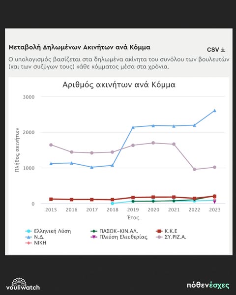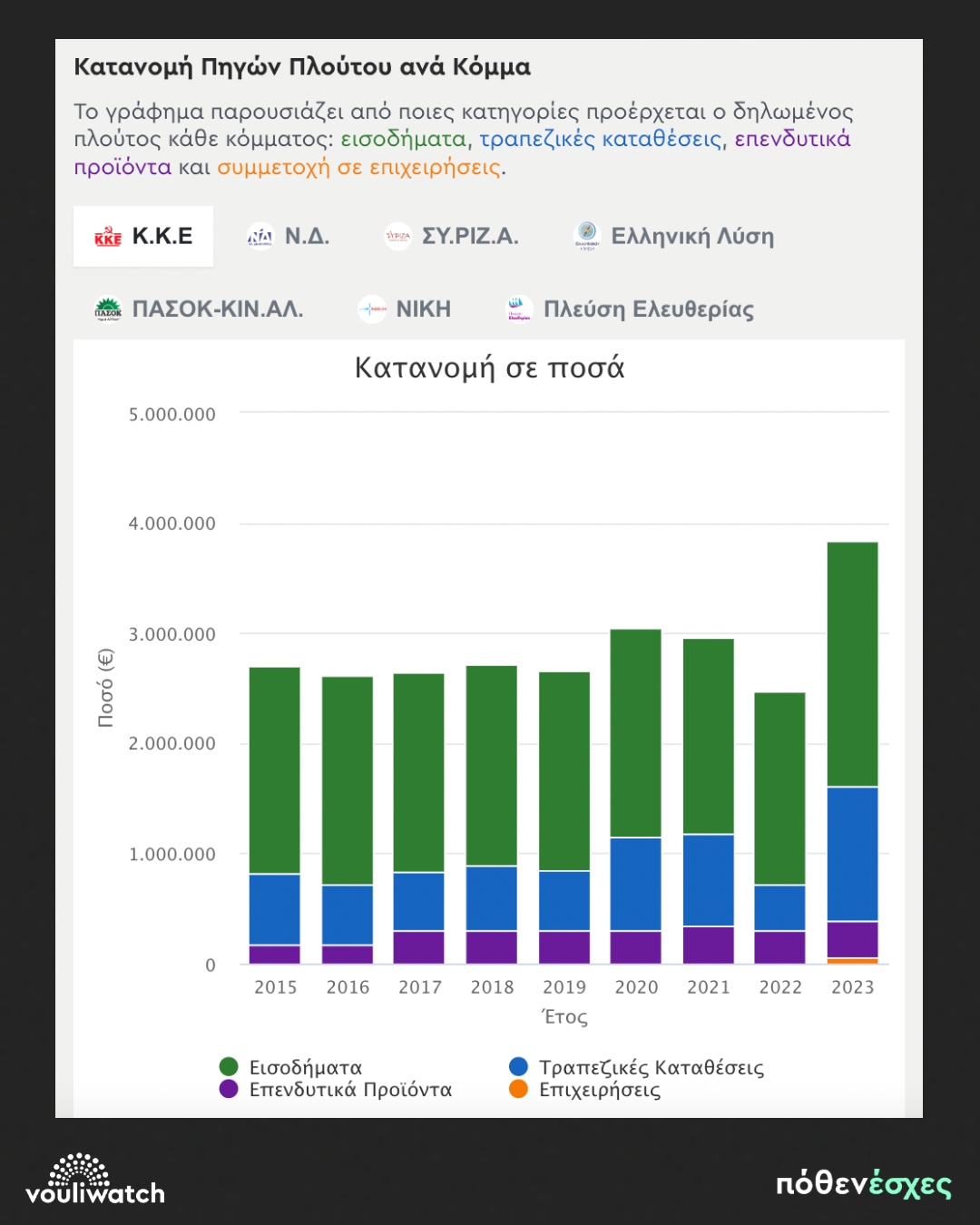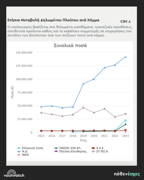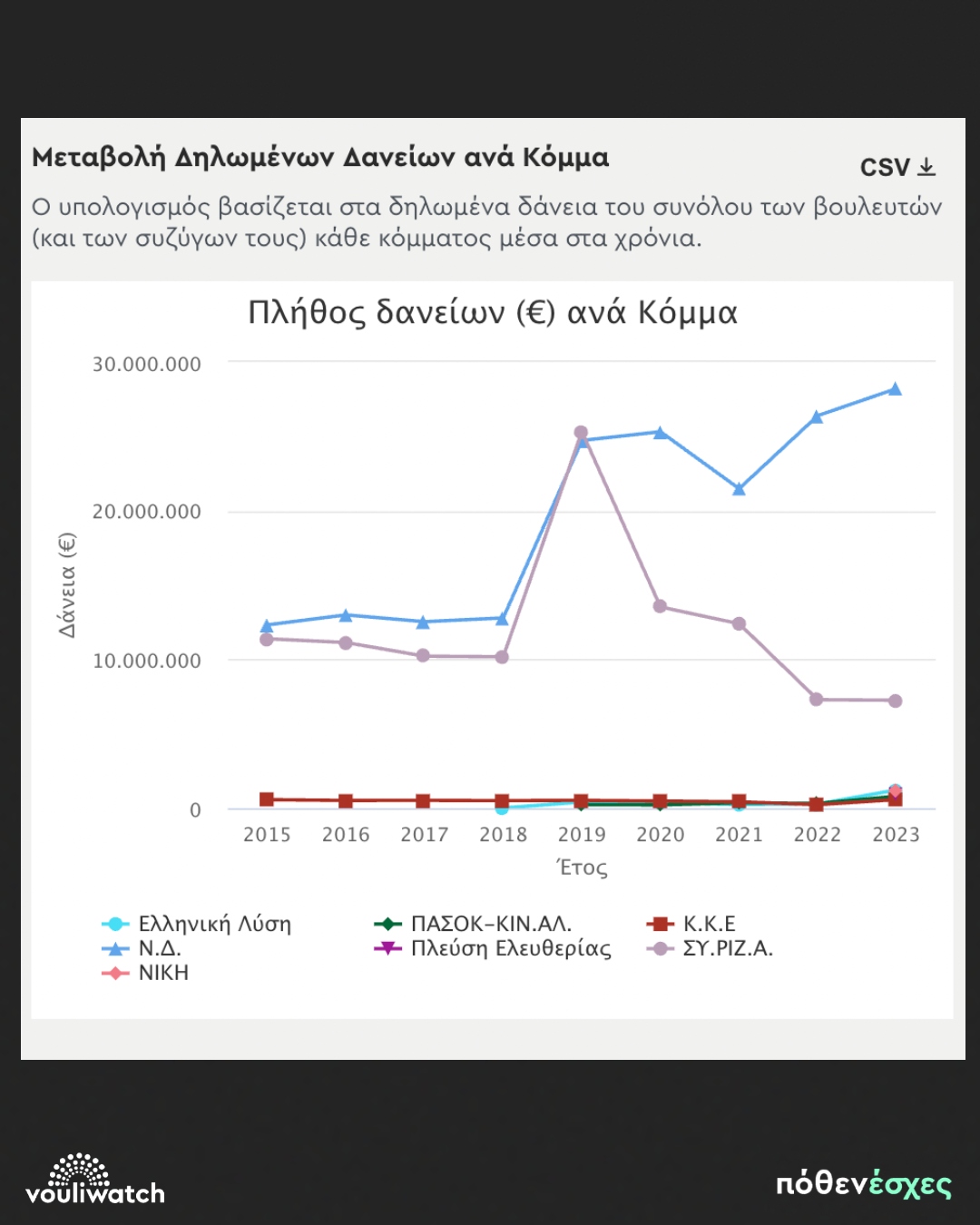 Αποκαλυπτικά για την οικονομική πορεία των κομμάτων και των βουλευτών τους μέσα στα χρόνια είναι τα στοιχεία που δημοσιεύει το Vouliwatch: Analytics για τα Πόθεν μέσα από τη νέα λειτουργία ανάλυσης & σύγκρισης (analytics) .
