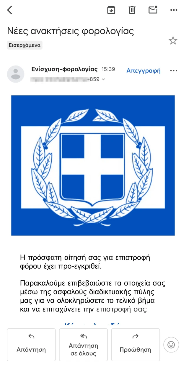Το μήνυμα αναφέρει χαρακτηριστικά: «Η πρόσφατη αίτησή σας για επιστροφή φόρου έχει προ-εγκριθεί. Παρακαλούμε επιβεβαιώστε τα στοιχεία σας μέσω της ασφαλούς διαδικτυακής πύλης μας για να ολοκληρώσετε το τελικό βήμα και να επιταχύνετε την επιστροφή σας».