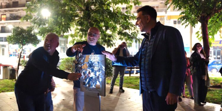 Η φωταγώγηση παρακολούθησαν πολίτες που συγκινήθηκαν βλέποντας τη μορφή του καλλιτέχνη να αναδύεται μέσα από το σκοτάδι.